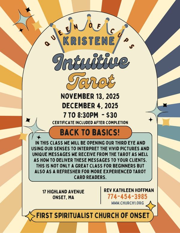 Thursday Nov. 13th & Thursday Dec. 4th - Introduction Intuitive Tarot Class by Queen of Cups 7pm to 8:30 - $30.; certificate included after completion- Back to Basics! In this class we will be opening our third eye and using our senses to interpret the vivid pictures and unique messages we receive from the Tarot as well as how to deliver these messages to your clients. This is not only a great class for beginners but also as a refresher for more experienced tarot card readers.